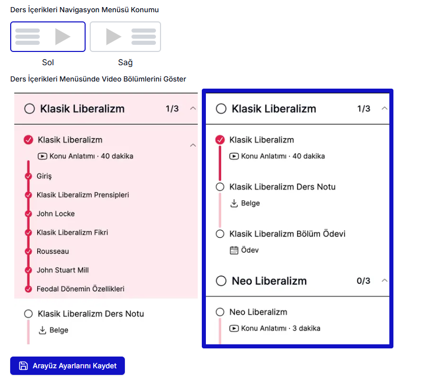 - Ders içerikleri navigasyon menüsünü Sol veya Sağ olarak konumlandırabilir, video bölümlerinin görünürlüğünü açıp kapatabilirsiniz.