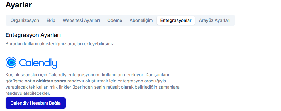 Organizasyonunuzu daha verimli kullanmak için çeşitli araç ve platformlarla entegrasyon sağlayabilirsiniz. Birebir görüşmelerinizi kolayca planlamak için Calendly entegrasyonunu kullanabilirsiniz. Calendly takvim entegrasyonu hakkında detaylı bilgi almak için Calendly Entegrasyonu sayfasını ziyaret edebilirsiniz.