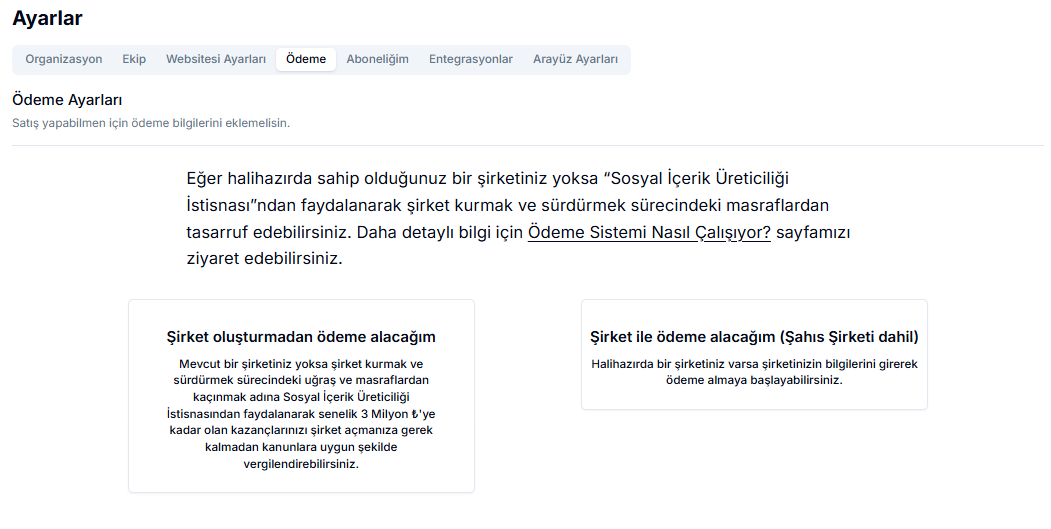 Satış yapabilmeniz için ödeme bilgilerini eklemeniz gerekmektedir. Ödeme sekmesinden ödemelerinizi nasıl almak istediğinizi belirleyebilirsiniz.