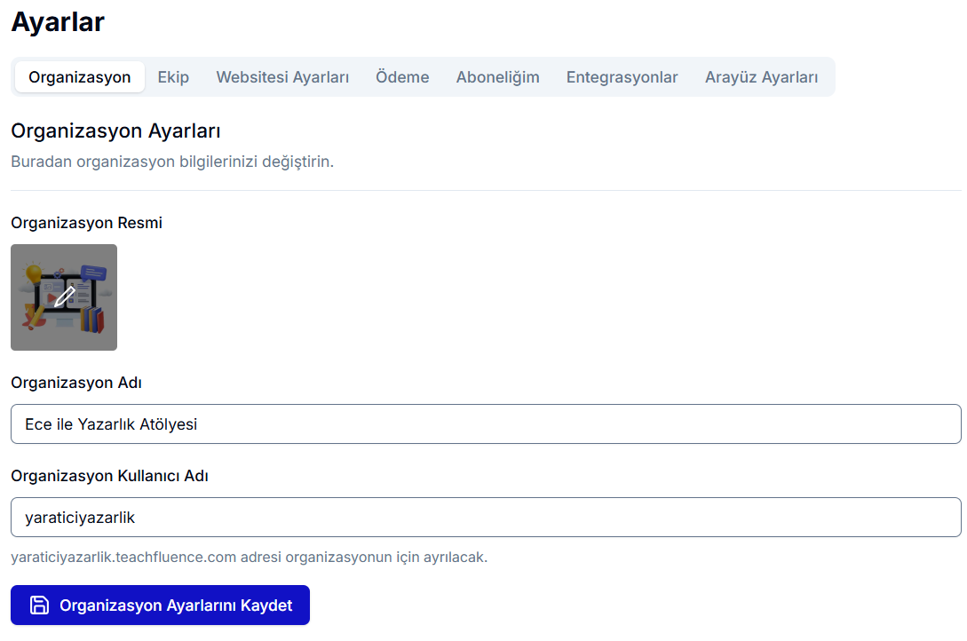 Teachfluence üzerindeki organizasyonunuz için bir ad belirleyebilir ve web sitenizde kullanılacak uygun bir kullanıcı adı oluşturabilirsiniz. Ayrıca organizasyonunuzu temsil edecek bir logo veya görsel ekleyebilirsiniz. Bu görsel, öğrencileriniz ve kullanıcılarınız tarafından görülen tüm alanlarda organizasyonunuzun tanıtımında kullanılır.