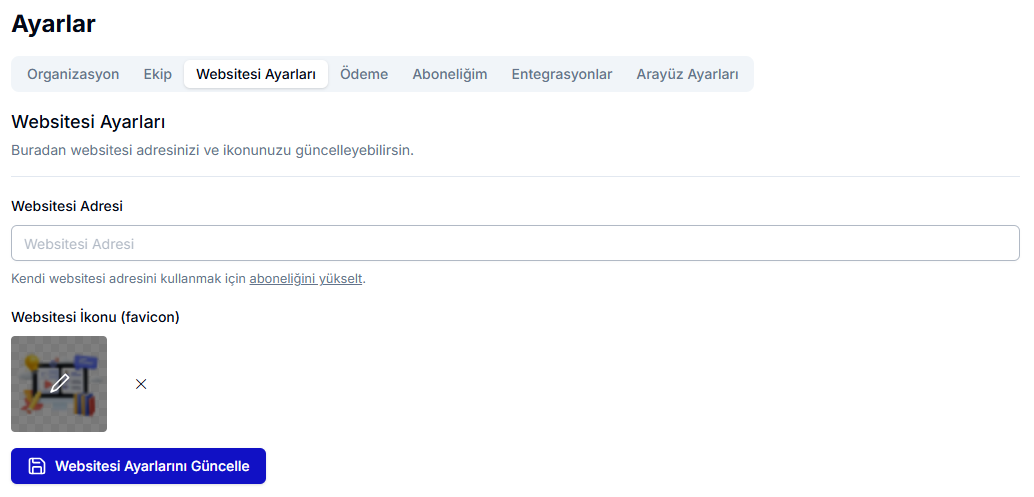 Web sitenizle ilgili web adresi ve favicon gibi temel ayarlar bu bölümden yönetilir. Favicon (websitesi ikonu), web sitenizin tarayıcı sekmesinde görünmesini istediğiniz simgedir. Favicon ile web sitenizin profesyonel görünmesini sağlayabilirsiniz.