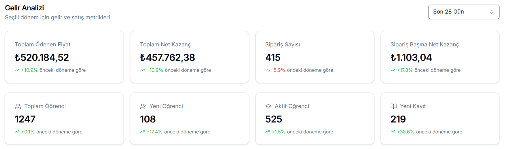 Sayfanın üst kısmında yer alan metrik kartlarında Toplam Ödenen Fiyat, Toplam Net Kazanç, Sipariş Sayısı, Sipariş Başına Net Kazanç, Toplam Öğrenci, Yeni Öğrenci, Aktif Öğrenci, Yeni Kayıt değerlerini görüntüleyebilirsiniz.