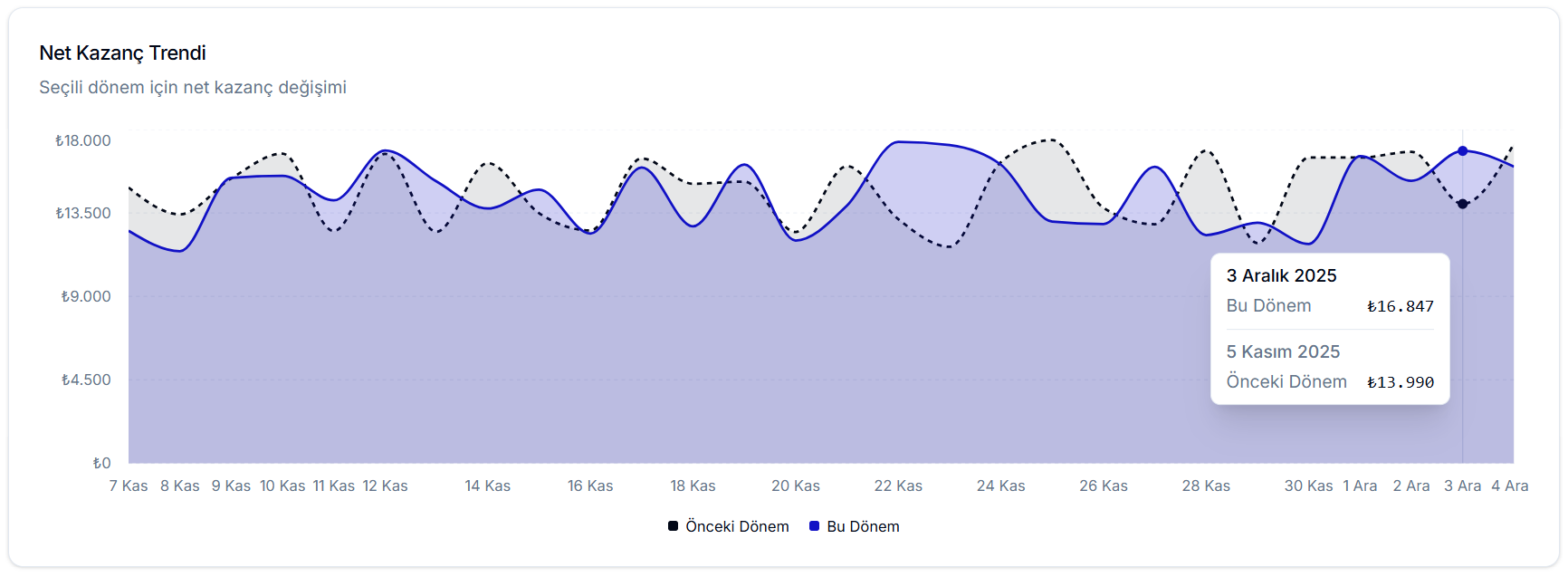 Bu bölüm, seçilen zaman aralığında günlük net kazanç değişimini detaylı olarak analiz etmenizi sağlar. Grafik üzerinde "Bu dönem" ve "Önceki dönem" verileri ayrı ayrı işlenerek iki dönemin karşılaştırmalı trendi sunulur. Böylece gelirdeki yükseliş ve düşüşleri görsel olarak kolayca takip edebilirsiniz.