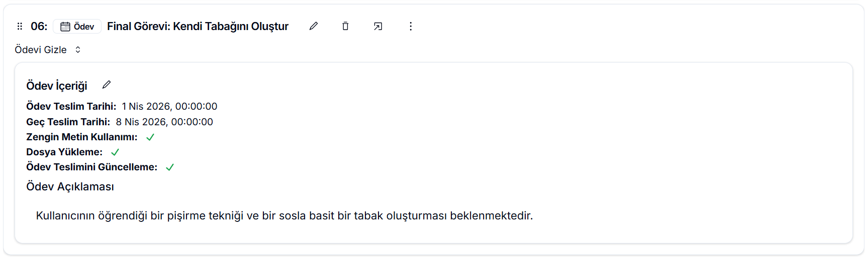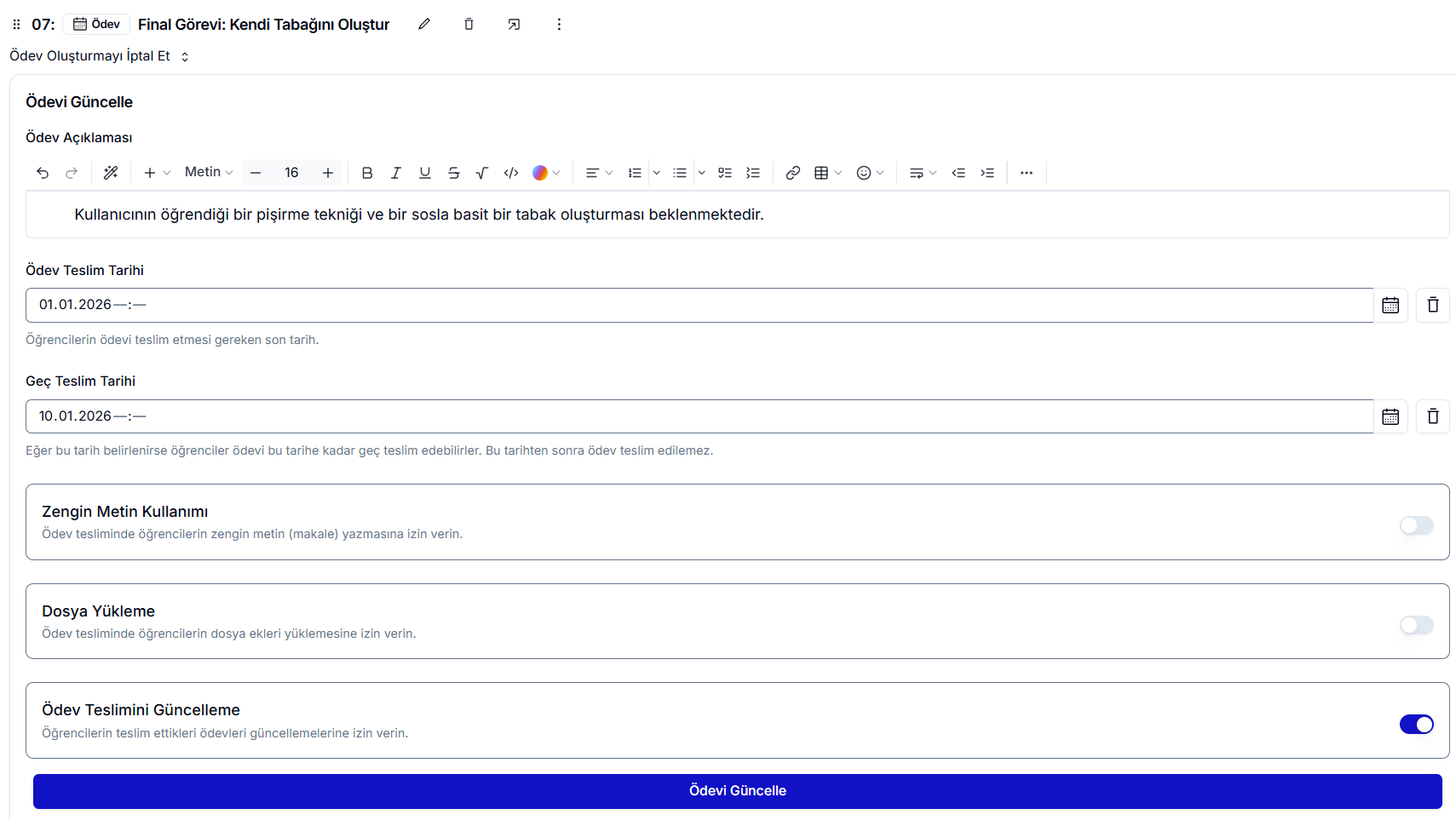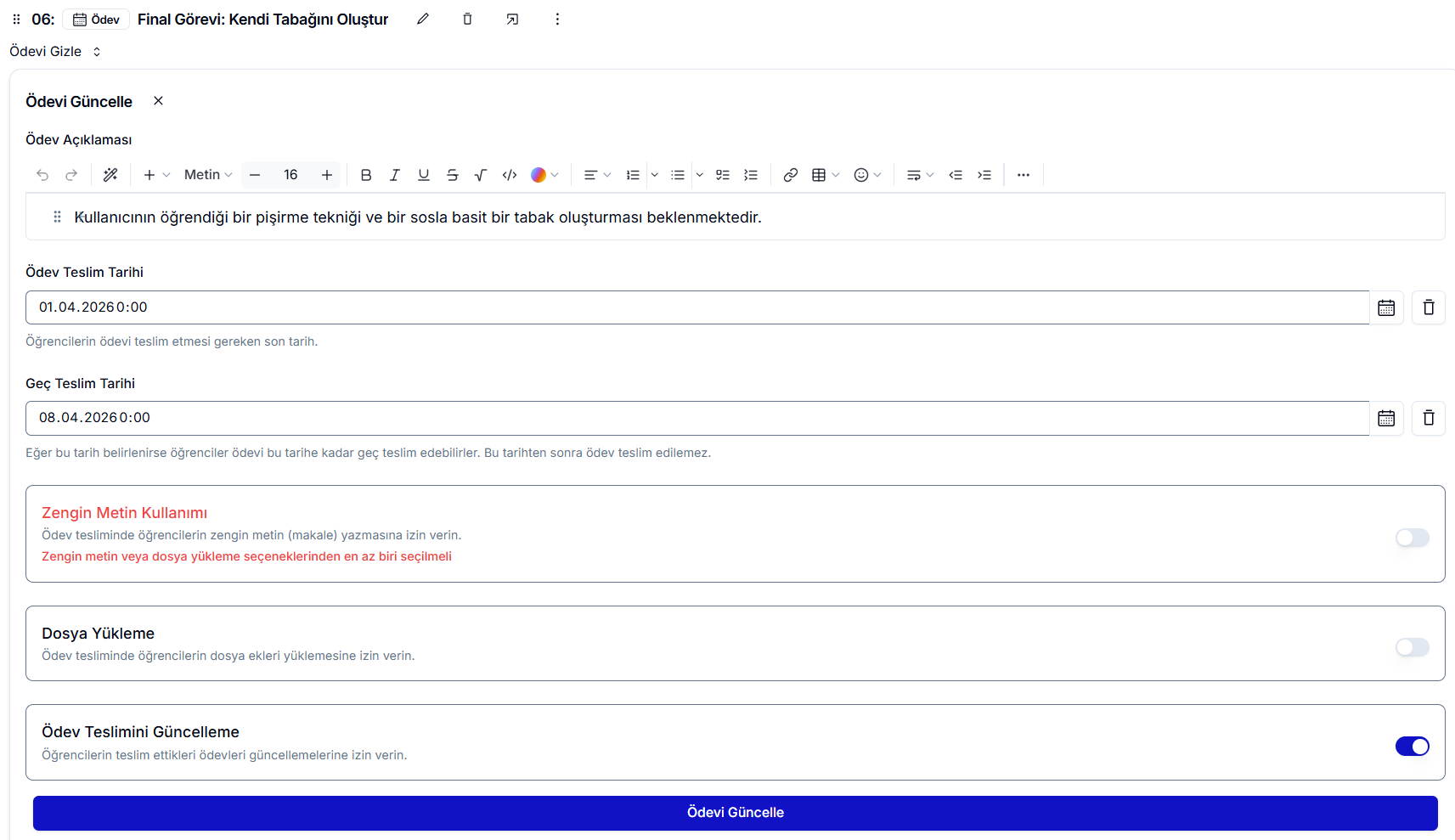- Dosya Yükleme: Bu seçenek aktifse, öğrenciler ödevi istedikleri formatta bir dosya yükleyerek tamamlayabilir.
