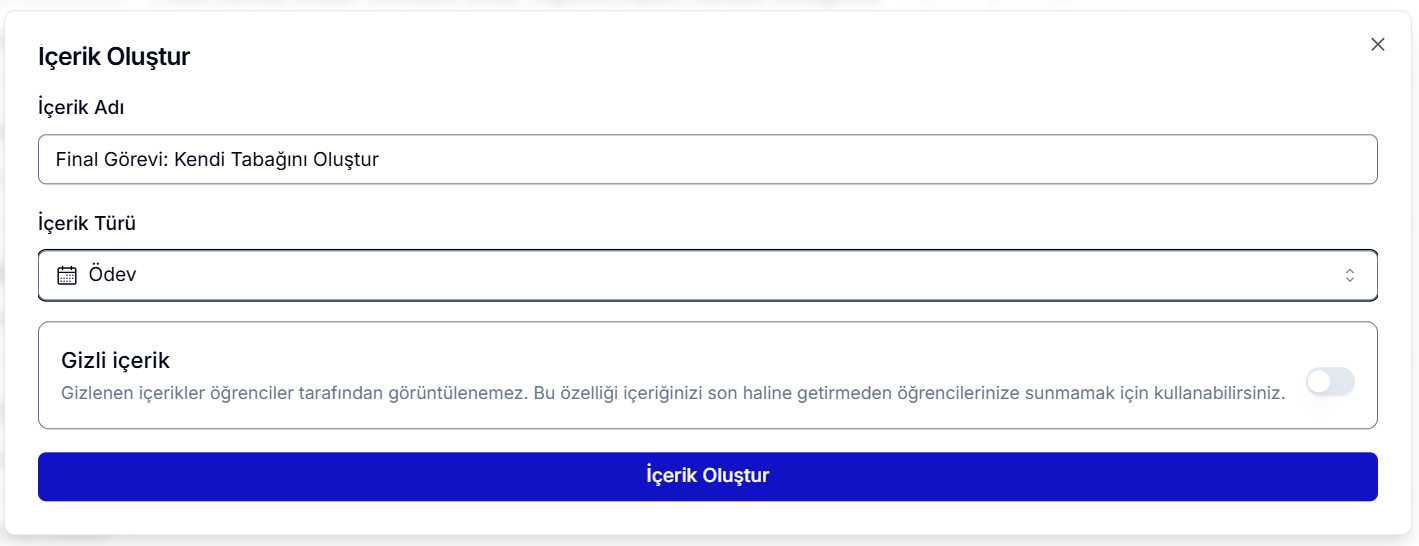 Ödev içerik türünü oluşturmak için, ödevi eklemek istediğiniz bölümün altındaki Yeni İçerik Oluştur butonuna tıklayın. Açılan panelden içerik türünü Ödev olarak seçmeniz ve ödevi isimlendirmeniz yeterlidir. Bu panelde ayrıca, ödevin öğrenciler tarafından görünür olup olmayacağını Gizli İçerik seçeneğinden ayarlayabilirsiniz.