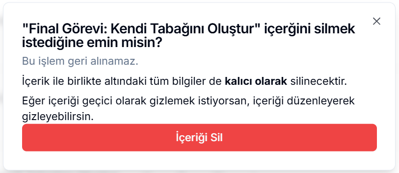 Çöp Kutusu İkonu: Ödevi kalıcı olarak dersinizden kaldırmak için kullanılır. Bu ikona tıkladıktan sonra açılan İçeriği Sil butonu ile ödevi silebilirsiniz..