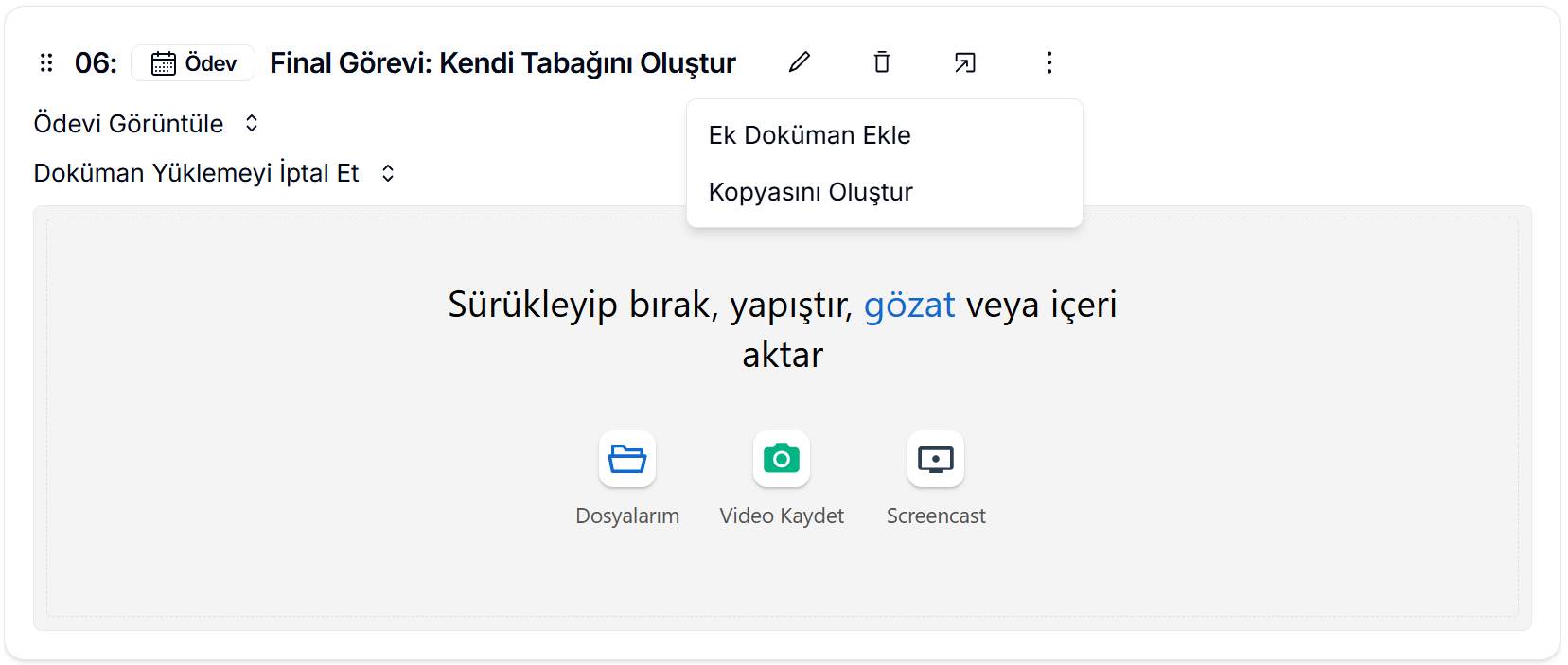 Üç Nokta İkonu: Ödevinize ekstra doküman eklemek veya mevcut ödevin bir kopyasını oluşturmak için kullanılır. Bu ikona tıkladı ğınızda açılan panelden PDF, görsel veya diğer dokümanları yükleyerek ödevi zenginleştirebilir ve aynı formatta yeni ödevler hazırlayabilirsiniz.