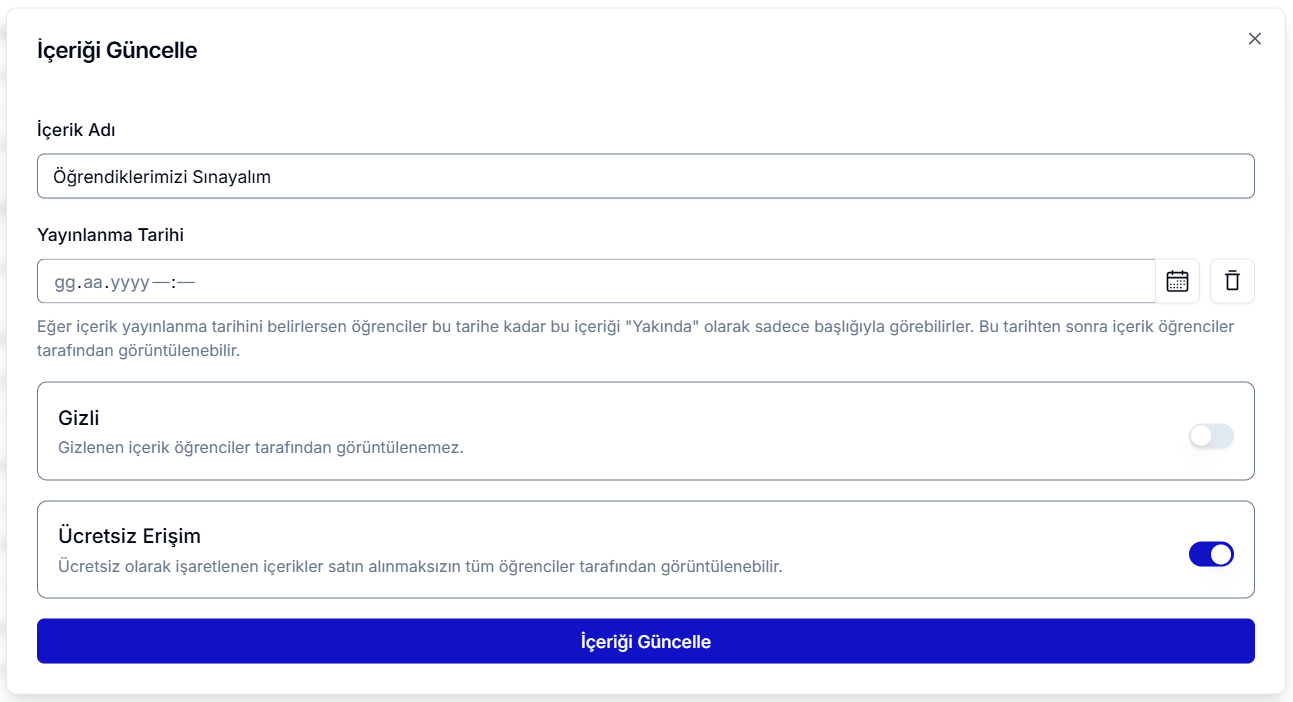 - Kalem İkonu: Sınavın adını, yayınlanma tarihini, öğrenciler için gizlilik durumunu ve ücretsiz erişim ayarlarını güncellemenizi sağlar. Yayın tarihi düzenlenirse, öğrenciler sınavı belirlediğiniz tarihe kadar çözemez ve sayfada sınavın hangi tarihte erişime açılacağına dair bir bilgilendirme görür. Ücretsiz erişim açılırsa, dersi satın almayan öğrenciler de sınavı çözebilir.