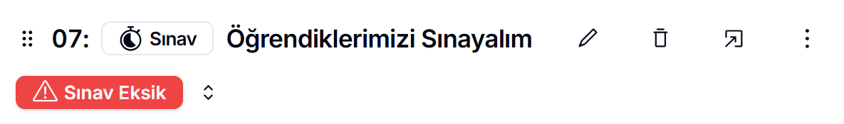 İçerik oluşturulduktan sonra, sınavınız ilgili bölümün altında yer alır. Ancak, bu aşamada sınav henüz tamamlanmadığı için içerik eksik kalır ve ekranda “Sınav Eksik” uyarısı görünür. Bu uyarı, sınavın gerekli sorular veya ayarlar ile tamamlanması gerektiğini belirtir.