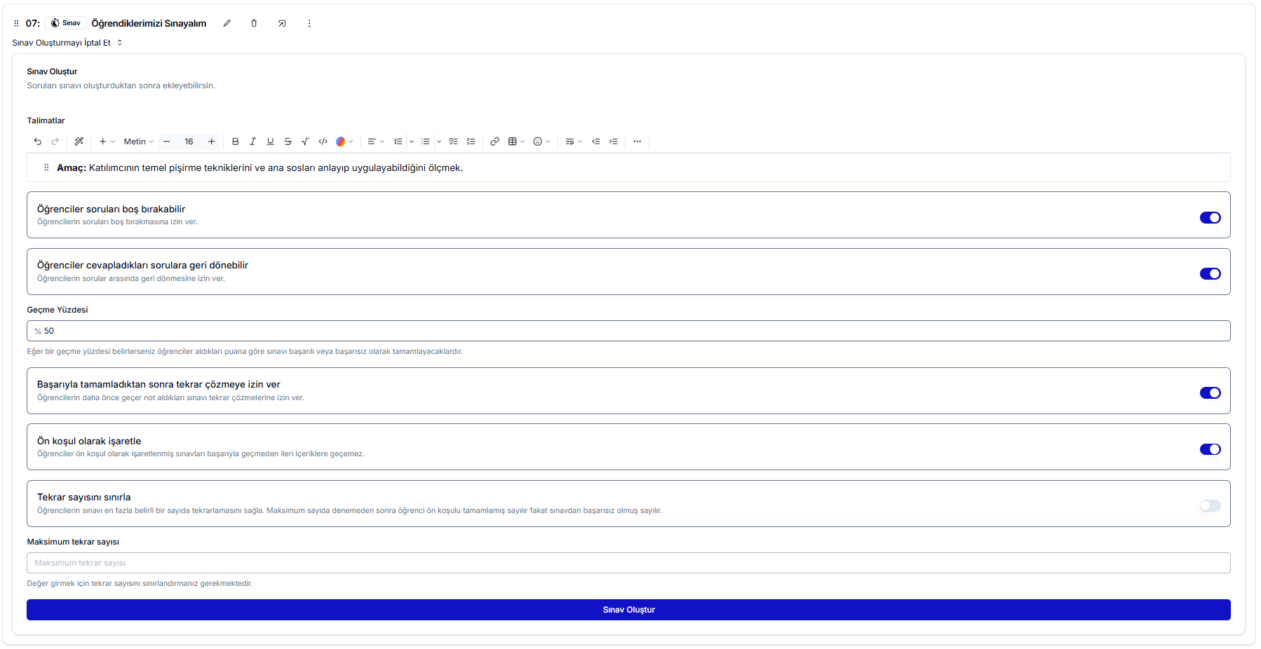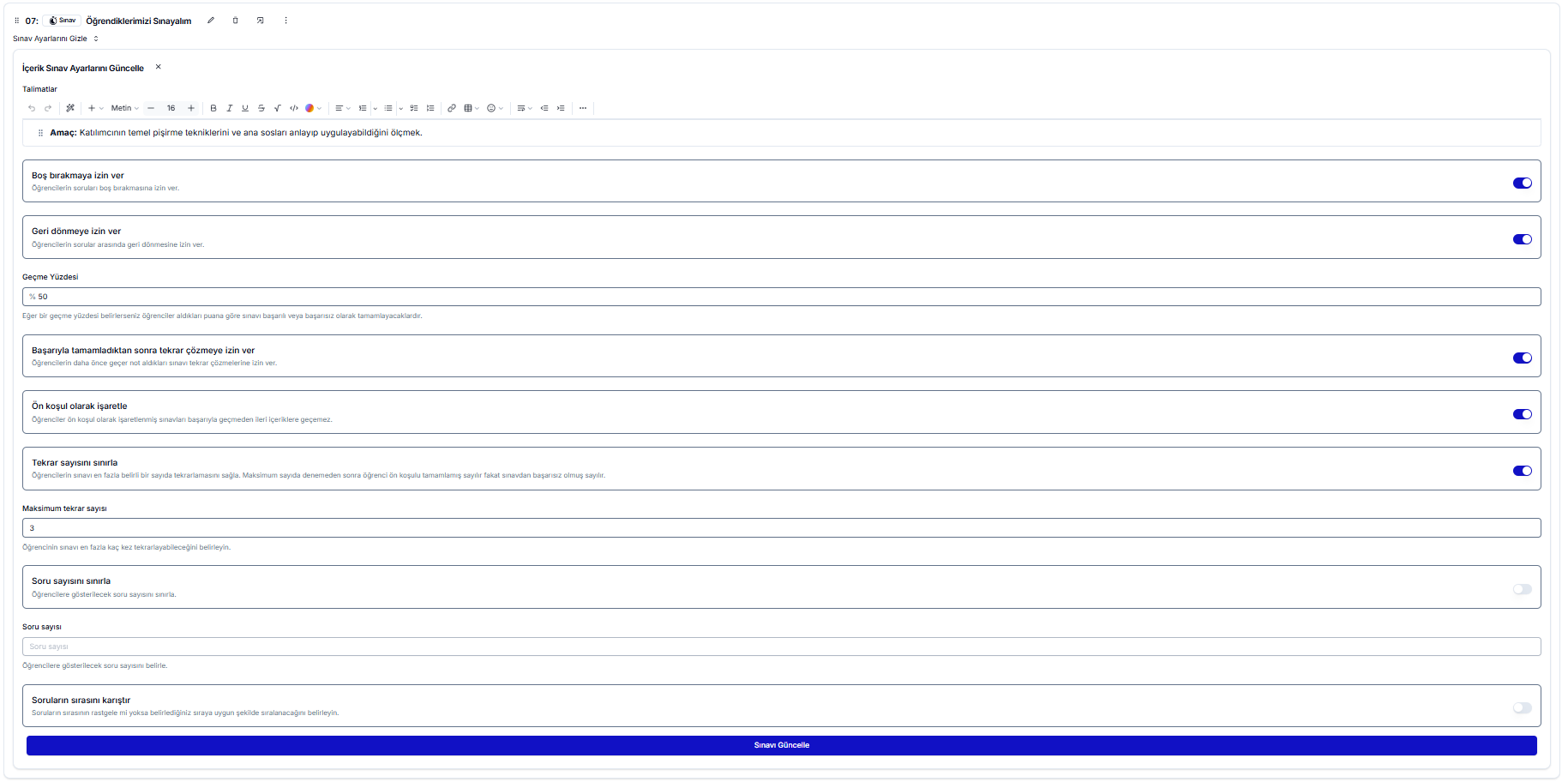 - Sınavı Tekrar Çözme Hakkı: Bu seçeneği aktif ederseniz, öğrenciler sınavı başarılı olarak tamamlamış olsalar bile tekrar çözebilirler.