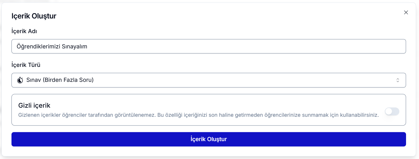 Sınav oluşturmak için ilgili bölümün altındaki Yeni İçerik Oluştur butonuna tıklayın. Açılan panelden içerik türünü Sınav (Birden Fazla Soru) olarak seçin ve sınavınıza bir isim verin. Bu panelde ayrıca Gizli İçerik seçeneğini kullanarak sınavın öğrenciler taraf ından ne zaman görüleceğini belirleyebilirsiniz. Bu seçenek, sınavın tamamlanmadan öğrenciler tarafından erişilmesini engellemek için kullanışlıdır.