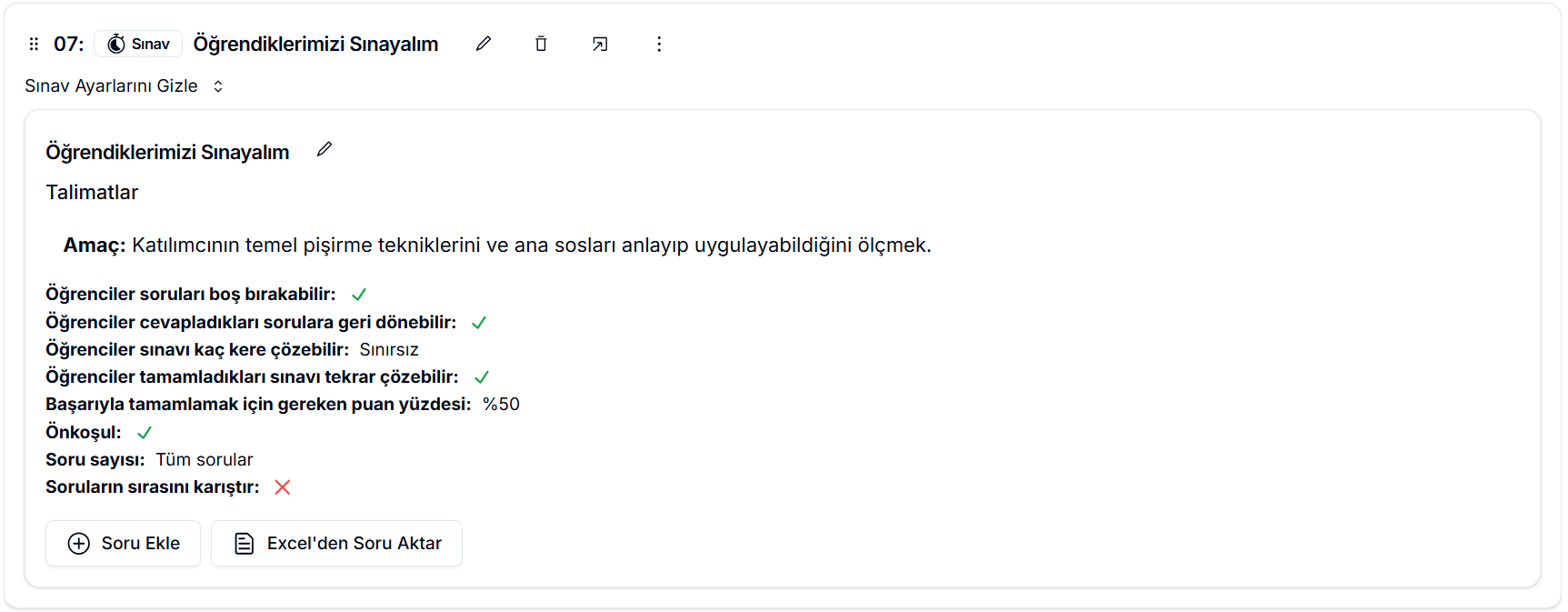 - Sınavı Ön Koşul Yapma: Sınavı ön koşul olarak işaretlerseniz, öğrenciler sınavı Başarılı tamamlamadan kursun diğer içeriklerine erişemez.