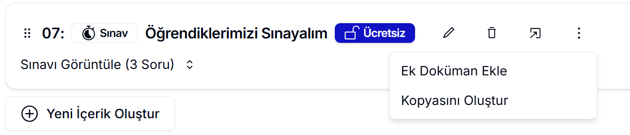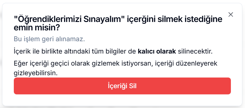 Çöp Kutusu İkonu: Sınavı kalıcı olarak dersinizden kaldırmak için kullanılır. Bu ikona tıkladıktan sonra açılan İçeriği Sil butonunu kullanarak sınavı silebilirsiniz.