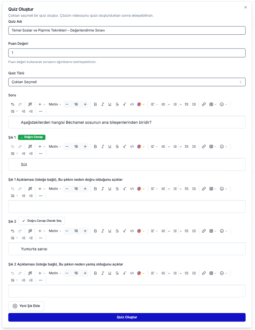 İçerik üzerindeki Sınav Sorusu Ekle butonuna tıklayarak sınavınıza soru eklemeye başlayabilirsiniz. Ekleyebileceğiniz sorular, Çoktan Seçmeli veya Açık Uçlu tiplerinde olabilir. Sorularla ilgili tüm detaylara, daha önce hazırladığımız Soru içerik türü dokümantasyonu üzerinden ulaşabilirsiniz. Ayrıca, her sorunun puanını, soruyu oluştururken gözüken Puan Değeri alanına girerek belirleyebilirsiniz.