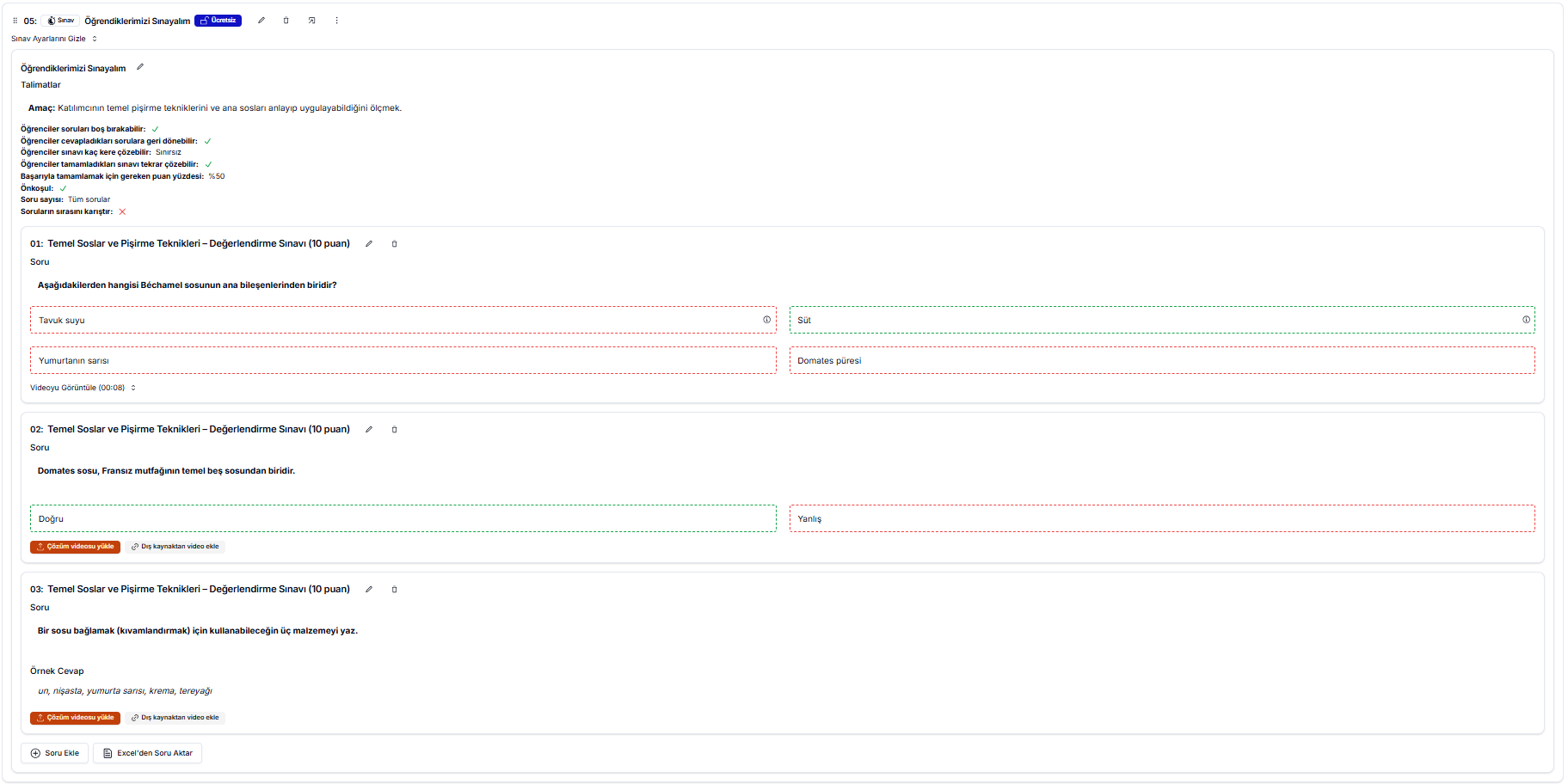 Sorularınızın her biri için ekranda görünen uyarıların üzerine tıklayarak, çözüm videolarını dış bir kaynaktan veya bilgisayarınızdan yükleyebilir ve öğrencilerle paylaşabilirsiniz. Ayrıca, soruların yanındaki kalem ikonuna tıklayarak soru ve cevaplarda değişiklik yapabilir, çöp kutusu ikonu ile de soruyu sınavınızdan kaldırabilirsiniz.
