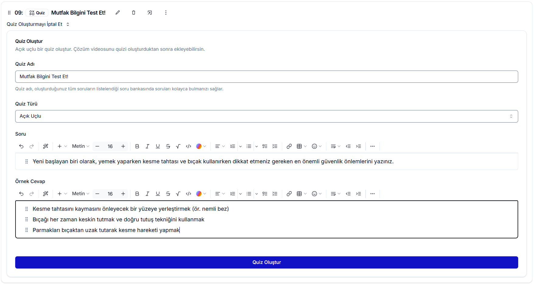 Açık Uçlu Soru tipinde bir quiz oluşturmak için, öncelikle sorunun açıklamasını yazmanız ve öğrencinin soruyu cevapladıktan sonra göreceği örnek cevabı eklemeniz yeterlidir.