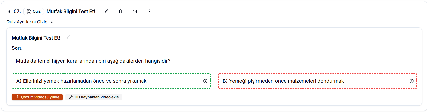 Quizinizi tamamladığınızda, sistem size sorunun özet görünümünü sunar. Bu ekrandan soruyu veya şıkları düzenlemek için kalem ikonuna tıklayabilir ve gerekli değişiklikleri yapabilirsiniz. Doğru işaretlediğiniz şık, öğrenciler için görünür şekilde yeşil kesikli bir çerçeve ile vurgulanır. Ayrıca dilerseniz bilgisayarınızdan ya da harici bir kaynaktan video ekleyerek sorunun çözümünü öğrencilerle paylaşabilir, böylece öğrenme deneyimini daha anlaşılır ve görsel hale getirebilirsiniz.