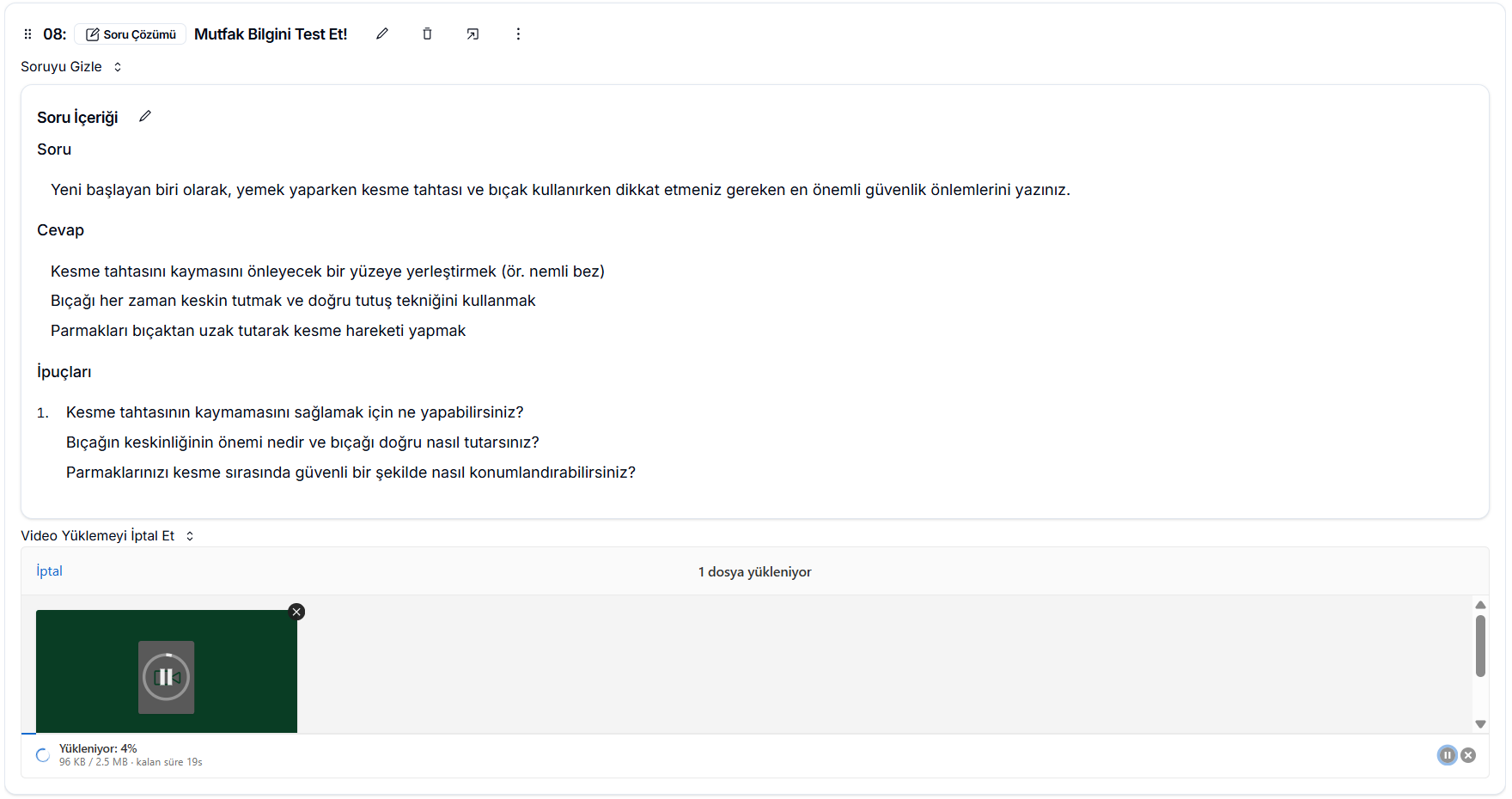 Quizinizi tamamladıktan sonra, özet görünümden soruyu ve örnek cevabı inceleyebilir, gerekirse kalem ikonuna tıklayarak değişiklik yapabilirsiniz. Ayrıca dilerseniz video ekleyerek, sorunun çözümünü öğrencilerle paylaşabilir ve öğrenme deneyimini daha görsel ve anlaşılır hâle getirebilirsiniz.