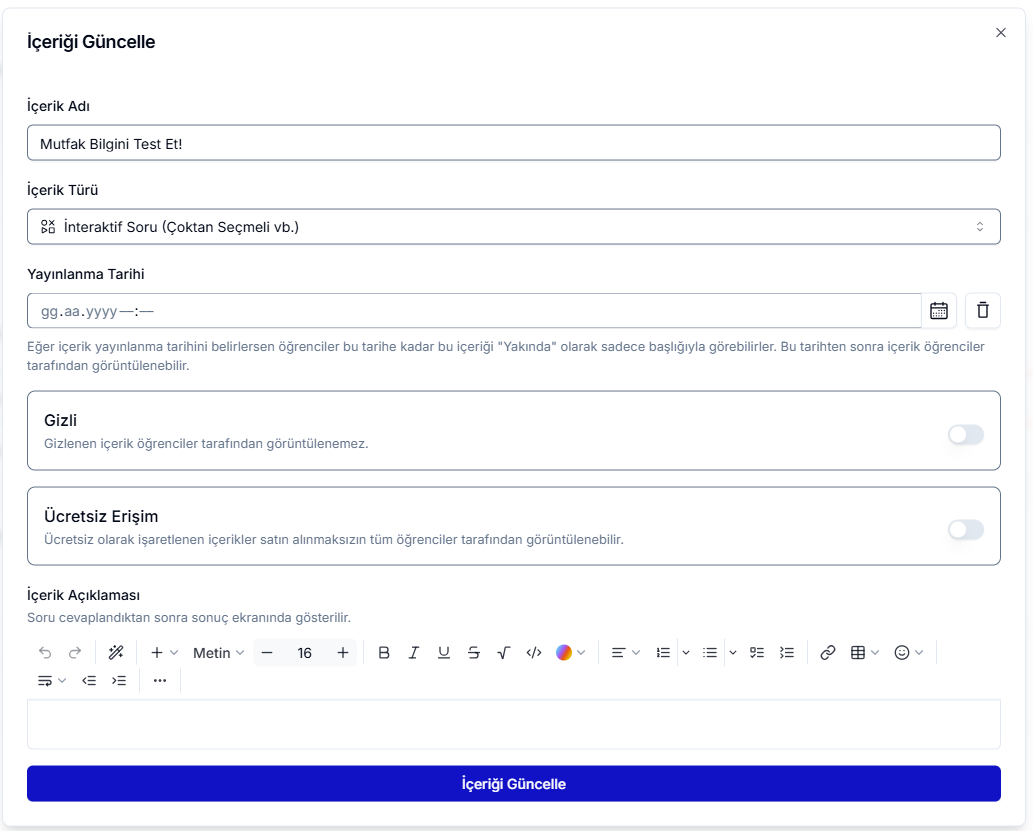 Kalem İkonu: Sorunun adını, yayınlanma tarihini, gizlilik durumunu ve ücretsiz erişim ayarlarını güncelleyebilirsiniz. Yayınlanma tarihi ileri alınırsa, öğrenciler bu içeriğe belirlenen tarihe kadar erişemez ve sistemde bilgilendirici bir mesaj görünür. Ücretsiz erişim açılırsa, dersi satın almayan öğrenciler de içeriği görebilir.