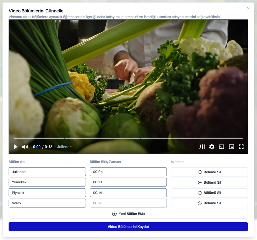 Bu ikonlara ek olarak, videonun hemen altında bulunan “Video Bölümlerini Güncelle” butonunu kullanarak, videonuzun belirli saniyelerine etiket ekleyebilir ve içeriğin daha kolay takip edilmesini sağlayabilirsiniz. Eğer bölüm sayısını artırmak isterseniz, “Yeni Bölüm Ekle” butonuyla yeni bir bölüm oluşturup saniyesini belirleyebilirsiniz. Ayrıca, bir bölümü kaldırmak için ilgili bölümün yanındaki “Bölümü Sil” butonuna tıklayarak o bölümü videonuzdan silebilirsiniz.