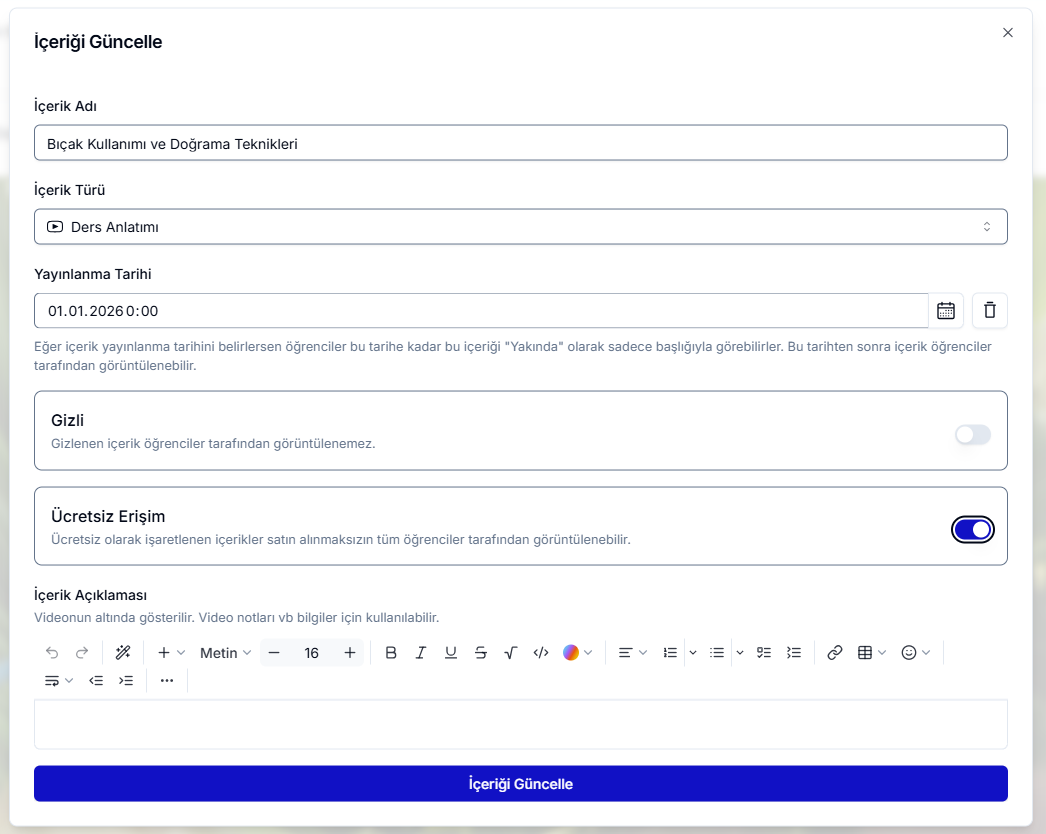 - Ücretsiz Erişim: Eğer bu seçenek açılırsa, dersi satın almayan öğrenciler de videoyu izleyebilir.