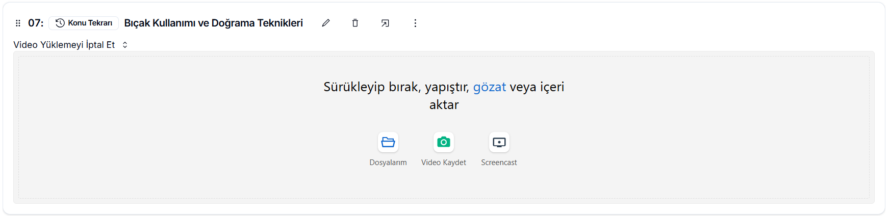 İçerik Oluştur butonuna bastıktan sonra, bölümün altında oluşturduğunuz yeni içeriği görebilirsiniz. Ancak henüz video yüklemediğiniz için içerik bu hâliyle eksik olacaktır. Bu aşamada dilerseniz videonuzu bir dış kaynaktan (ör. YouTube, Vimeo) ekleyebilir veya kendi bilgisayarınızdan istediğiniz videoyu yükleyebilirsiniz.