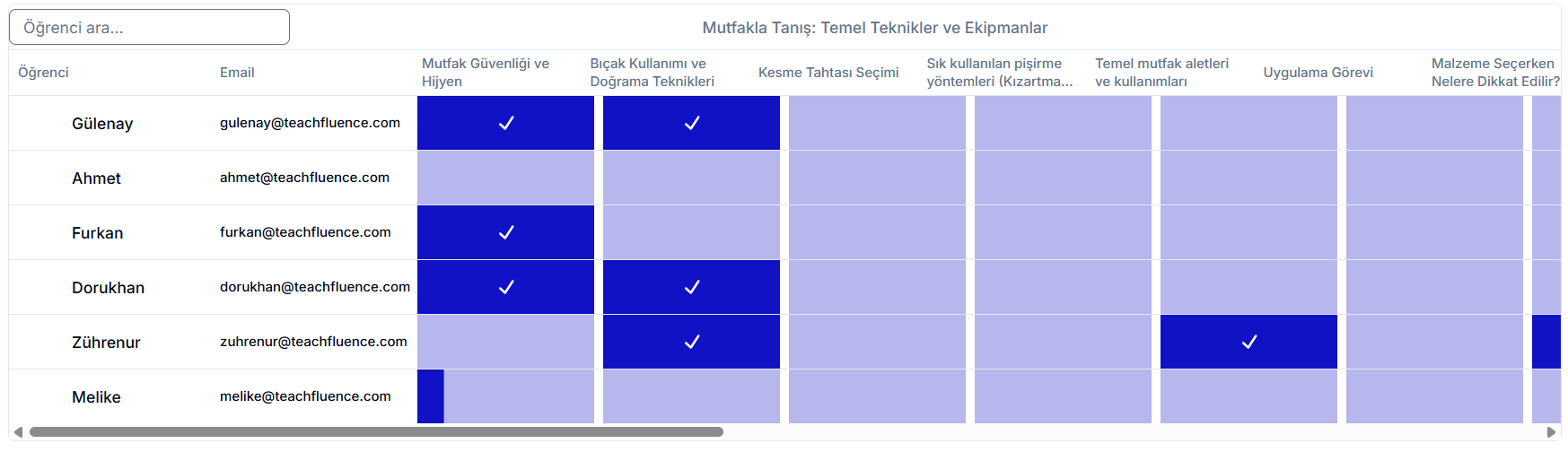 Her kursunuzun öğrencilerini görüntülerken aynı zamanda öğrencilerin ilerlemelerini de takip edebilirsiniz. Bu bölümde öğrencilerin: