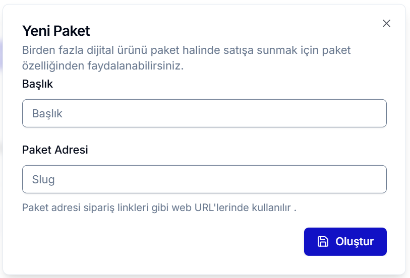 Açılan ekranda paketin başlığını ve URL adresini belirleyip oluşturma işlemini tamamlayabilirsiniz.