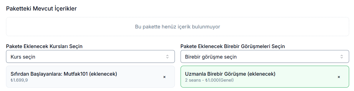 Aynı ekranda, pakete dahil ettiğiniz kursları ve birebir görüşmeleri Paketteki Mevcut İçerikler bölümünde görebilir, “Kurs seçin” ve “Birebir görüşme seçin” alanlarını kullanarak içeriklerinizi paketinize ekleyebilirsiniz.