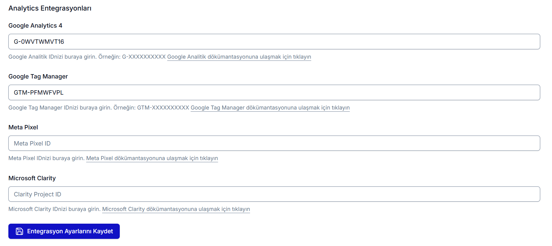 - Google Analytics, Meta Pixel, reklam dönüşüm kodları gibi tüm izleme kodlarını tek panelden yönetebilirsiniz.