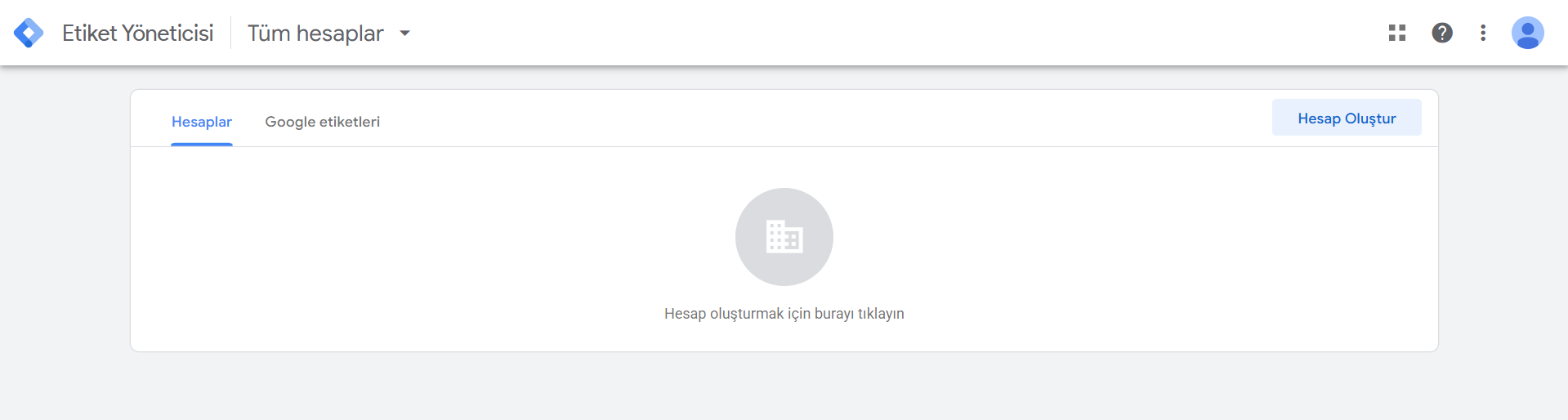 Google Tag Manager entegrasyonuna başlamak için öncelikle Google Tag Manager'e Google hesabınızla giriş yapmanız gerekir. Ardından yönlendirildiğiniz sayfada yer alan Hesap Oluştur butonuna tıklayarak kurulum sürecini başlatabilirsiniz.