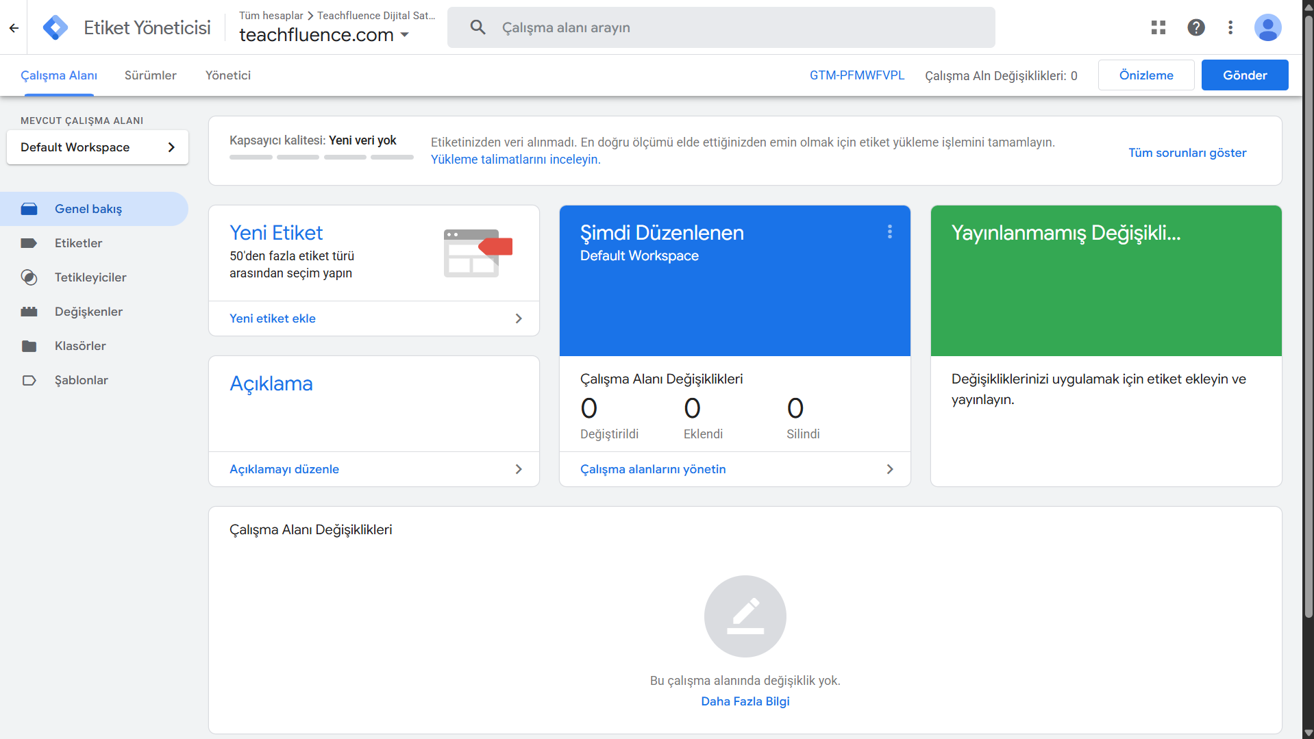 Kurulum popup’ını kapattıktan sonra GTM sizi otomatik olarak ana panele yönlendirir. Panelin en üstünde GTM Kimliği (GTM-XXXXXXXXXX) bulunur. Bu kimlik Teachfluence üzerinden Google Tag Manager entegrasyonunu sağlayabilmeniz için gereklidir.