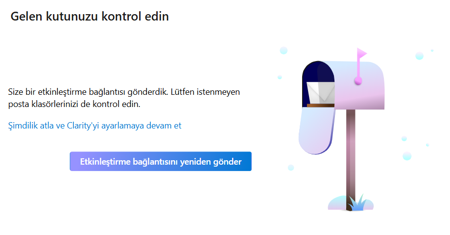 Devam etmek istediğiniz seçeneği seçtiğinizde Clarity, gerekli hesap izinlerini ister. İzinleri onayladıktan sonra e-postanızı onaylamanız istenir ve ardından bir doğrulama linki gönderilir.