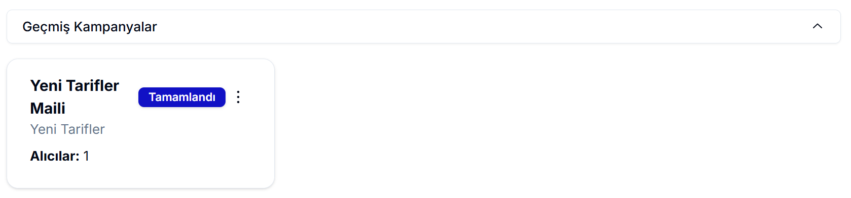 Bu bölümde, daha önce gönderilmiş ve tamamlanmış tüm kampanyalar listelenir. Böylece geçmiş performanslarını kolayca inceleyebilir ve dilediğiniz kampanya detayına geri dönebilirsiniz.