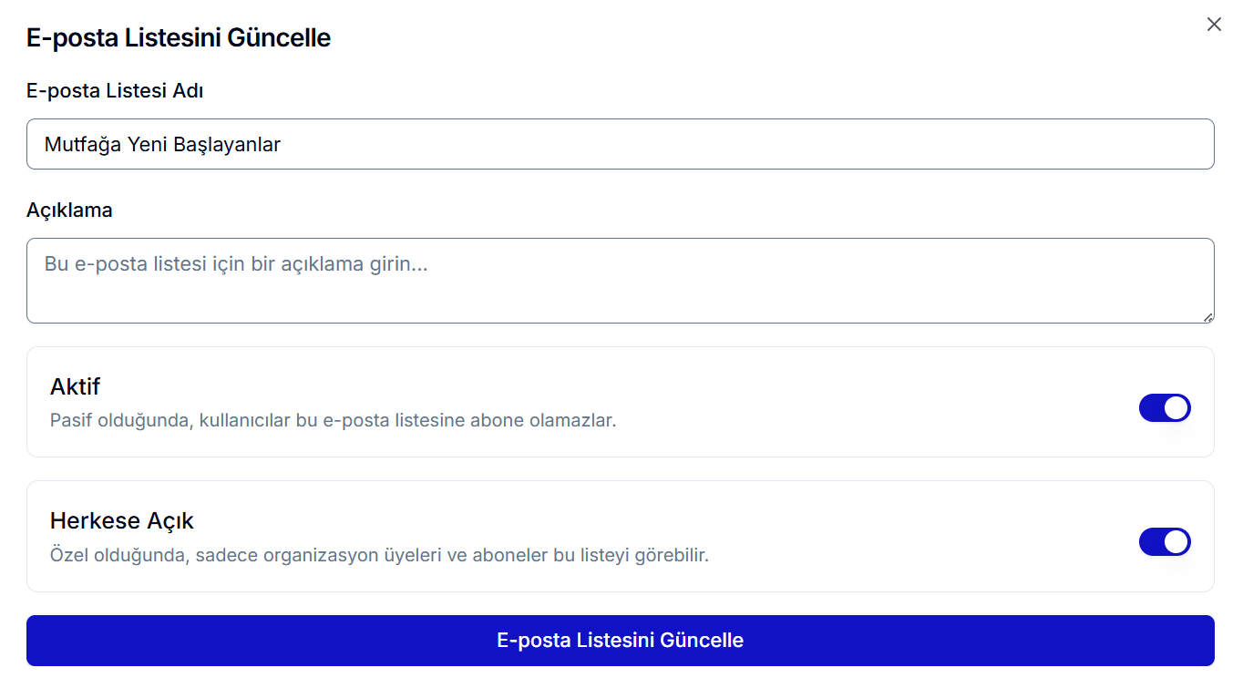 Bir listeyi düzenlemek için liste adının yanındaki seçenekleri kullanabilirsiniz. E-posta listesi adı, açıklama, durum ve görünürlük alanlarını güncelleyebilirsiniz.